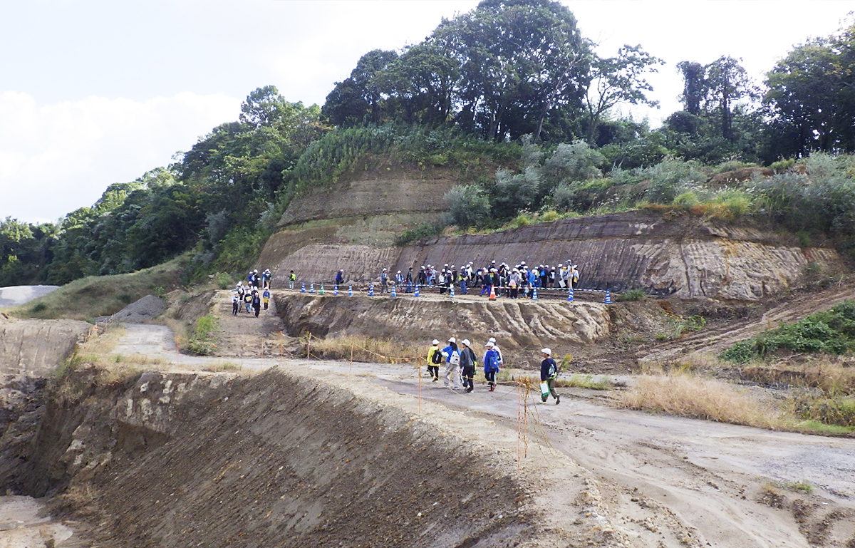 本社にある造成地では、掘削した大地の壁面を走る地層を見学でき、大分市内の小学校は勿論、県内外の小・中学校の勉強に役立てています。