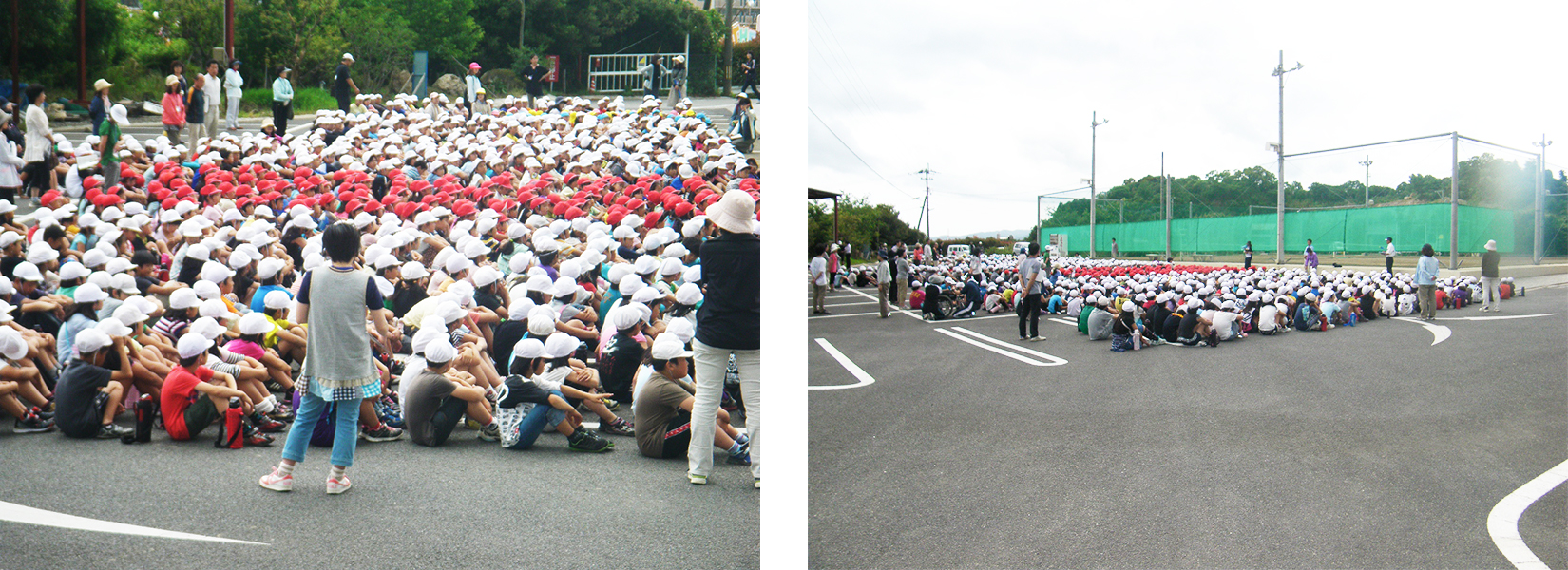 大分市横田地区では、水害が発生又は発生のおそれがある場合の緊急一時避難場所として当社敷地内を活用下さい。 (写真は大在小学校の児童や住民の方々)